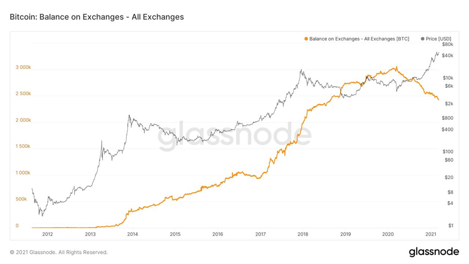 With each institutional purchase, the number of BTC stored at exchanges declines further, with the trend picking up steam and falling even further as the year progresses.