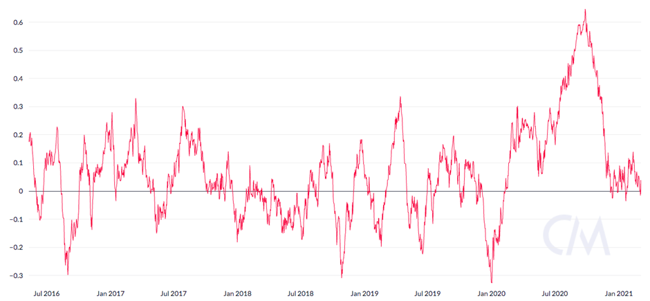 Gold and Bitcoin Correlation Chart, by Coin Metrics